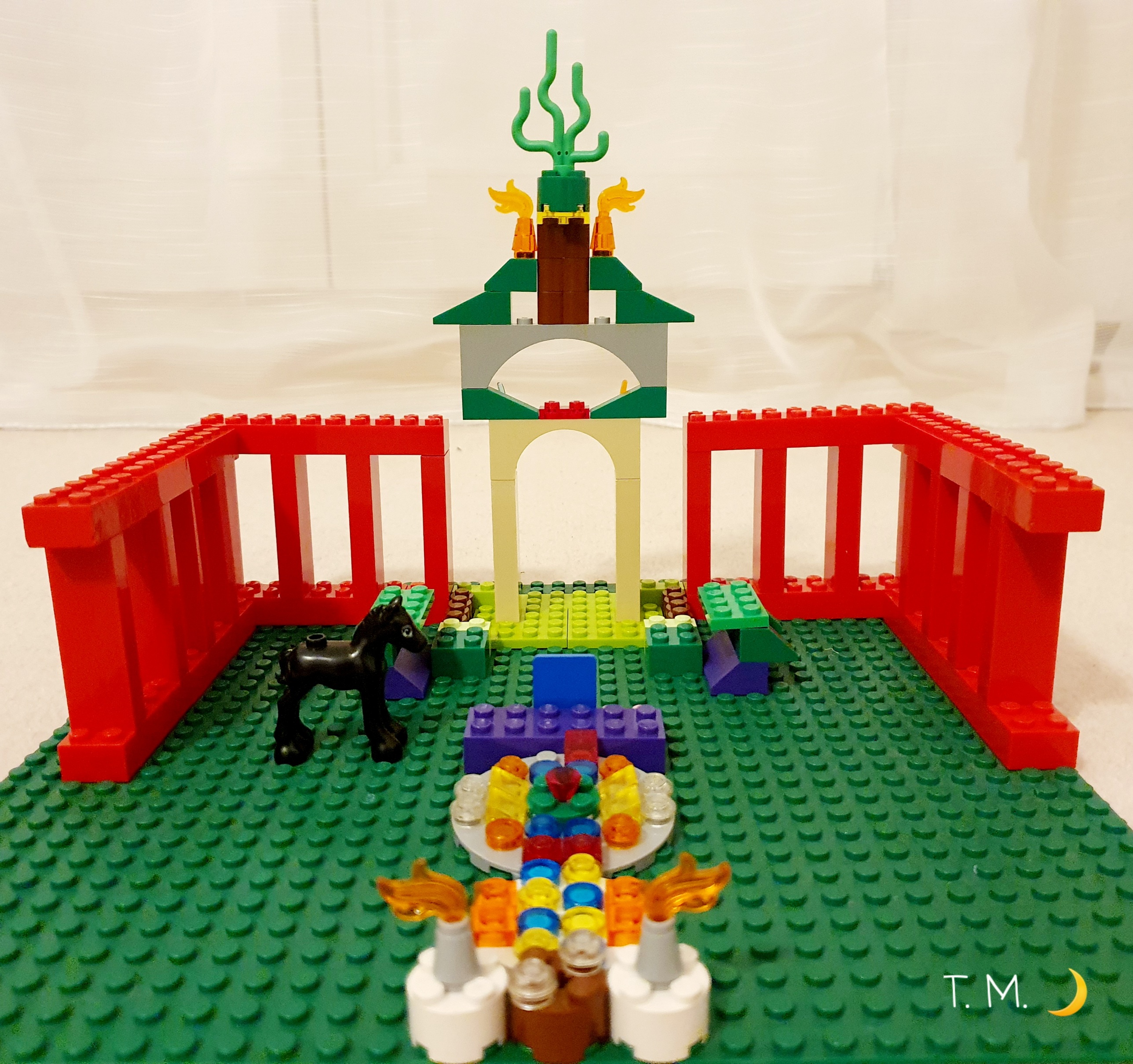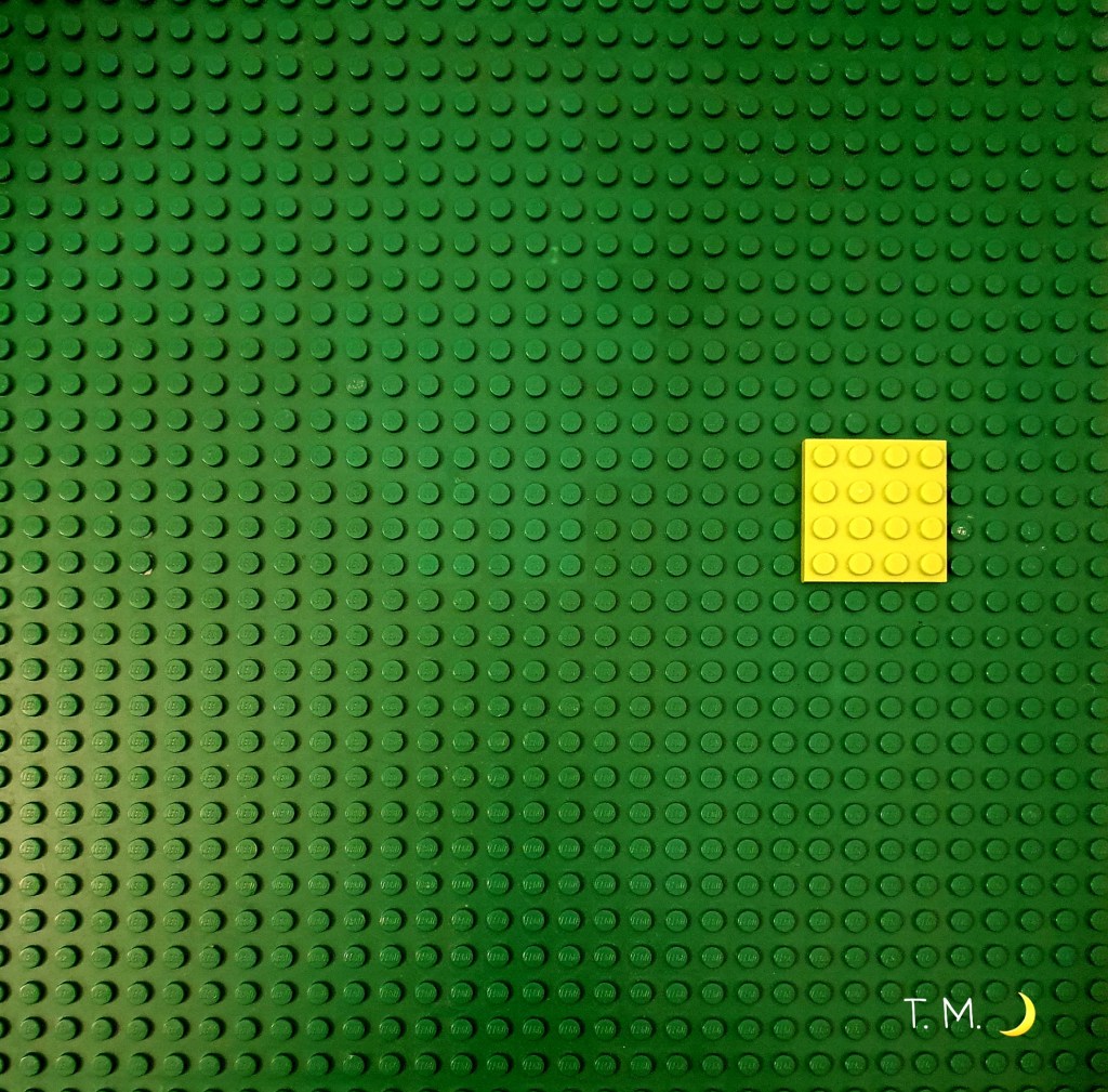 So habe ich dann auch versucht an das Legobauen mit meinem Kind heranzugehen. Ich hatte diese dunkelgrüne Legoplatte, einen Haufen Legosteine vor mir und hatte keine Ahnung was ich damit bauen sollte. Mein innerer Anspruch war es etwas ganz großartiges zu erschaffen. Das innere Barometer verzeichnete zuverlässig einen Druckanstieg. Mein Herz schlug schneller, der Atem wurde flacher, der Stresspegel wollte quasi abheben… Ich konnte es sehr gut als Beobachter wahrnehmen und konnte sogar gegensteuern. Ich konzentrierte mich auf meinen Atem und ließ ihn ruhig und gleichmäßig werden. Mein Kind setzte derweil fleißig Stein auf Stein auf seiner grünen Platte. Okay dachte ich. Hier sind keine weiteren Schiedsrichter (aus meinem inneren) zu sehen. Jetzt setze ich einfach ein paar Steinchen hier hin, ein paar Steinchen dort hin… Erst einmal EINE Lösung finden. Einen Schönheitspreis musste ich ja nicht gewinnen, das hatte ich ja sichergestellt… Und so entstand nicht nur dieses lustige Gebilde, sondern auch ein neuer Weg für mich im Umgang mit dem „Anfangen“ und dem „Unbekannten“. Ich machte die Erfahrung, dass weniger Druck auch zum Ziel führt und ich mich dabei sogar gut fühlen darf.