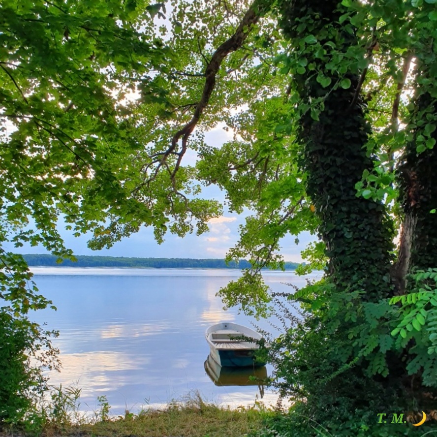 So friedlich liegt das Boot auf der stillen Wasseroberfläche des Sees. Das Grün der Blätter leuchtet frisch, das Blau des Wassers und des Himmels schimmern sanft… Das Bild schenkt mir Kraft und Hoffnung und das Vertrauen, dass Dinge gut werden können.